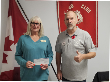 PRESIDENT BOB HUGHES PRESENTS CHEQUE FOR $3000 TO BRENDA LECLAIR DIRECTOR OF OUR CHATHAM FOOD BANK